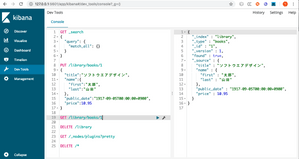 これでようやくブラウザから、kibanaにアクセスし、dev toolからelasticsearchにデータを投入できるようになりました。