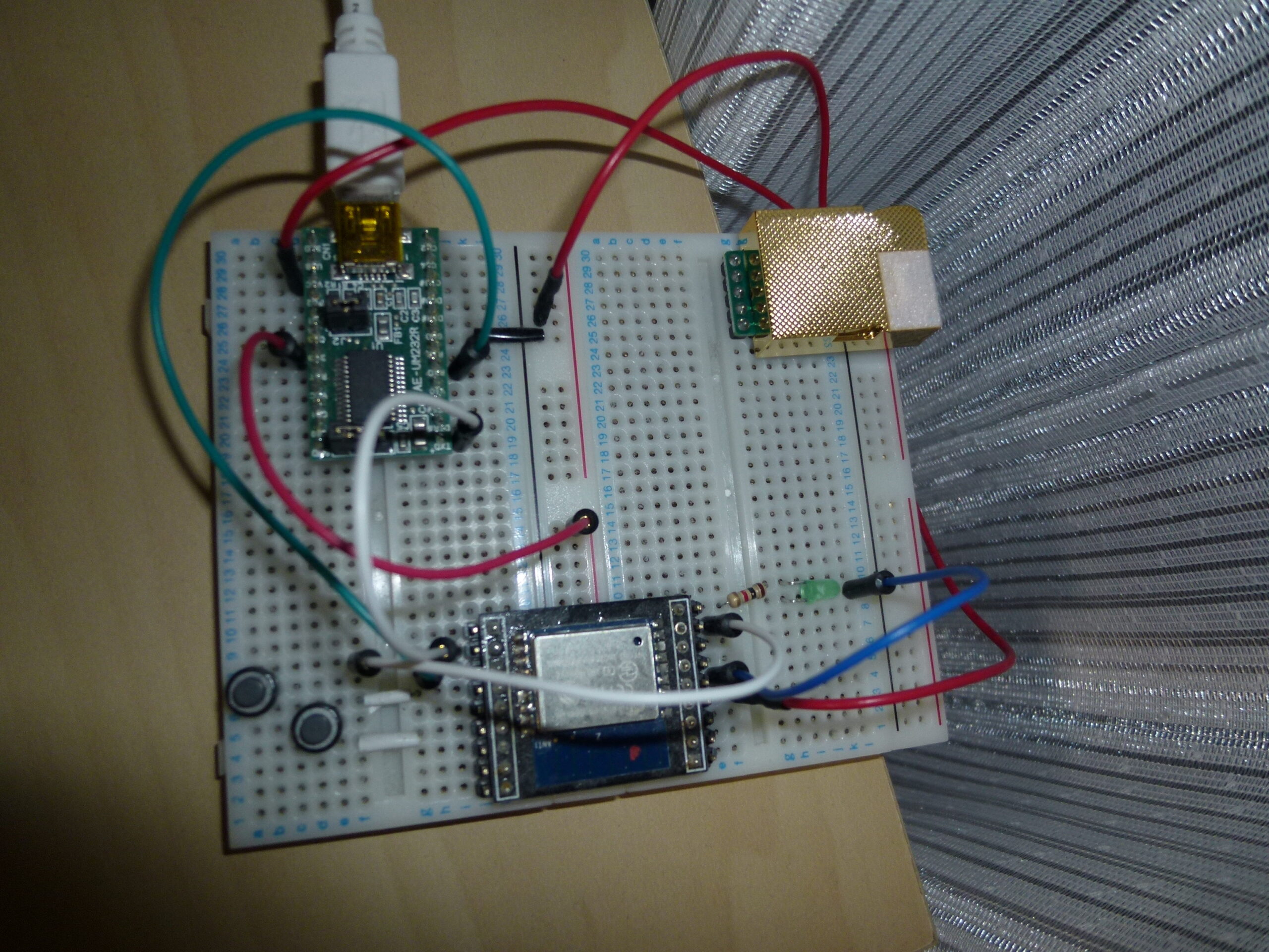 今回利用したセンサーはMH-Z19C (Amazonで3,300円)というもので、過去に別件で使ったESP-WROOM-02とFTDI社のUSBシリアル変換器(AE-UM232R)をブレッドボード上で結線して回路を組みました。プログラムの作成と書き込みのための開発ツールとしては前回同様、Arduinoを使用しました。センサーからの測定値はPWM端子から取得し、センサーに必要な5Vの電源はAE-UM232RのVccから供給しました。下の画像が結線が終わった状態の様子ですが、センサーのピンが微妙にブレッドボードの穴の位置に合わないようでしたので、使用しない方だけブレッドボードにさして、使用する方はオスメスのコネクタケーブルで直接結線しました。
