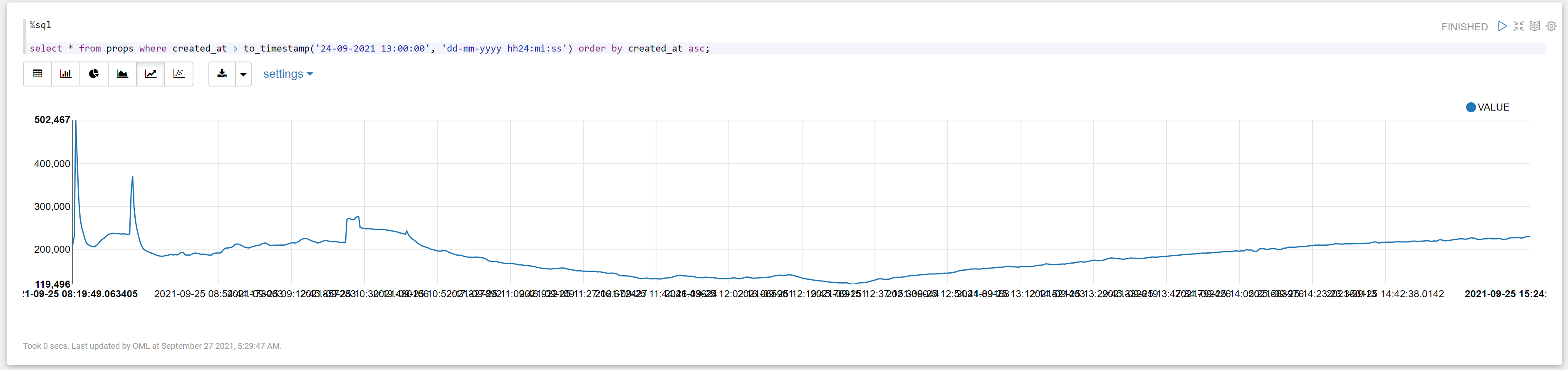 DBに蓄積したデータを見える化する部分については、できるだけ楽をしたかったので、OCIのサービスの一つであるOracle Machine Learningのノートブックでグラフ化することにしました。このノートブックはApache Zeppelinがベースとなっているので、DBからのデータ取り込みもSQLを使えば簡単にできます。あと、OML4Pyを使えばpythonでもDBから取り込んだデータを扱えるようですが、今回はSQLのSELECTの結果をそのままノートブックの機能でグラフにしてみました(グラフのボタンを押すだけ)。その結果が以下です。