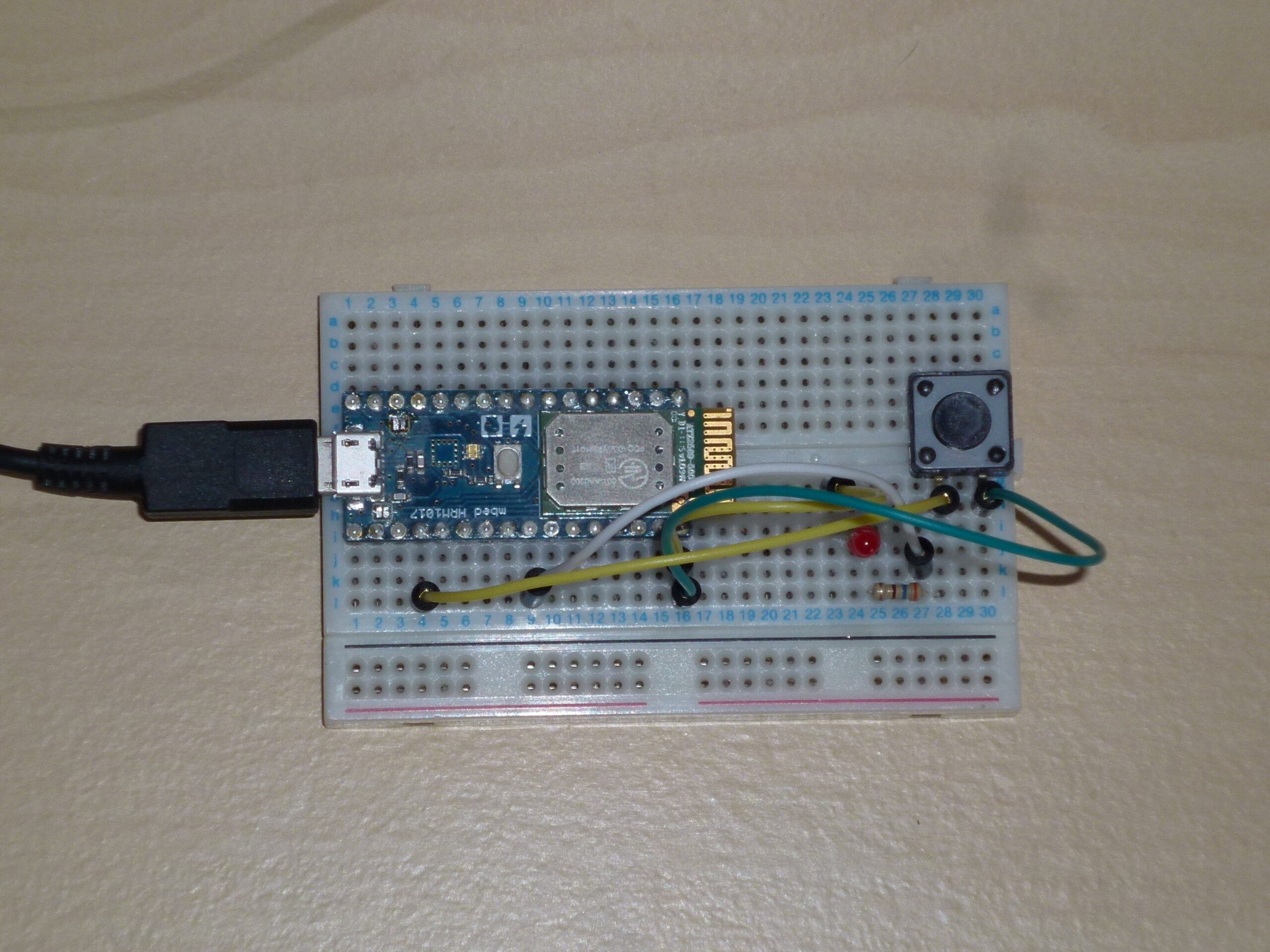 rustの組み込み開発について調査したところ、Nordic社のnRF51シリーズ向けの開発を行うクレートとしてnrf51-halがあることがわかりましたので、このクレートを使ってみることにしました。このクレートのソースをgithubからとってきて、同梱されているサンプルプロジェクト(blinky-button-demo)をテンプレートとして使用しました。このデモプログラムは、ボタンを押すとLEDが点灯する、という単純なものになっています。念のため、期待通り動くか実際にmbedにLEDとボタンをつないで後述する方法でビルド、イメージのフラッシュ書き込み、実行すると、問題なく動作しました。結線はいつものようにブレッドボード上で行いました。