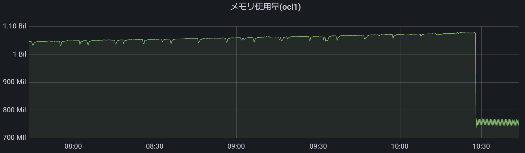 個人的にPHPで実装したAPIサーバを、apache2を含んだPHPのDockerイメージ(php:8.0.10-apache-buster)で稼働していたのですが、このコンテナがメモリリークをしているらしいことがわかり、原因を調査しました。同じような悩みを持つ方のページを拝見したところ、apache2のMaxRequestsPerChild(2.4ではMaxConnectionsPerChild)を減らすとよいとのことで、設定を確認してみたところ、MaxConnectionsPerChildが0、つまり上限なしに設定されていました。原因はこれかと思い、この値を3に変更してみたところ、これまで単調増加していた使用メモリが、以下の画像のように単調増加しなくなりました。