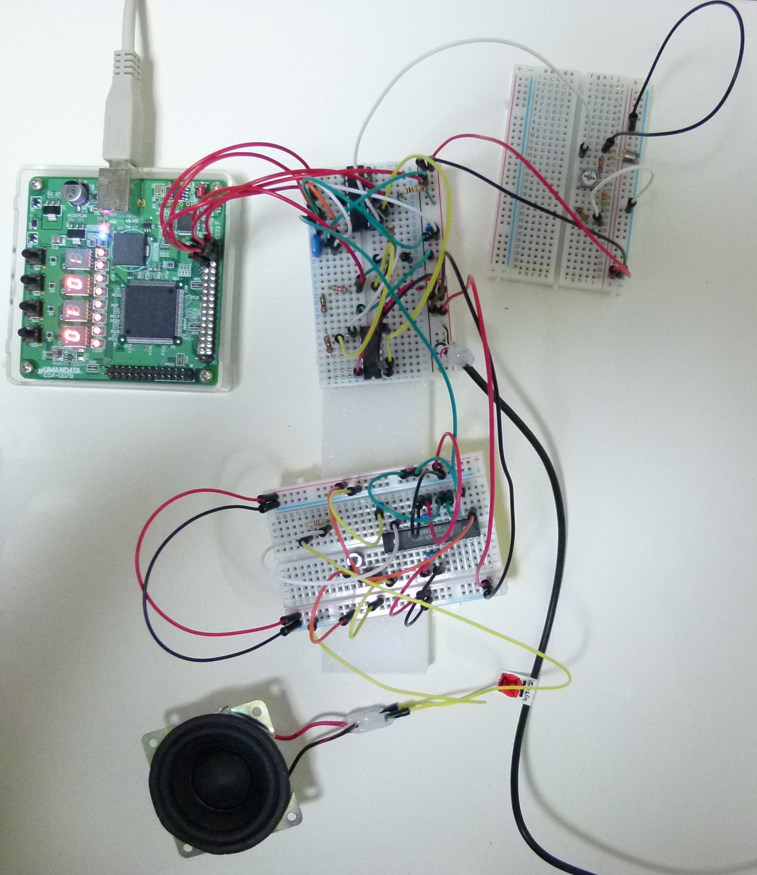PICの方のプログラムですが、音声合成LSIにテキストを送り込むため、前回作ったUARTの送信機能をそのまま流用することにしました。いくつかサンプルデータを流したところ、問題なく音声LSIで合成音を鳴らすことができました。リモコン信号はフォトトランジスターからの信号を抵抗で適当に調整して入力ピンに入力しています。今回は、正確なデータを読み取るのではなく、単にボタンが押されたことを検出するためだけのものですので、データの内容を読み取るところまでは行っていません。