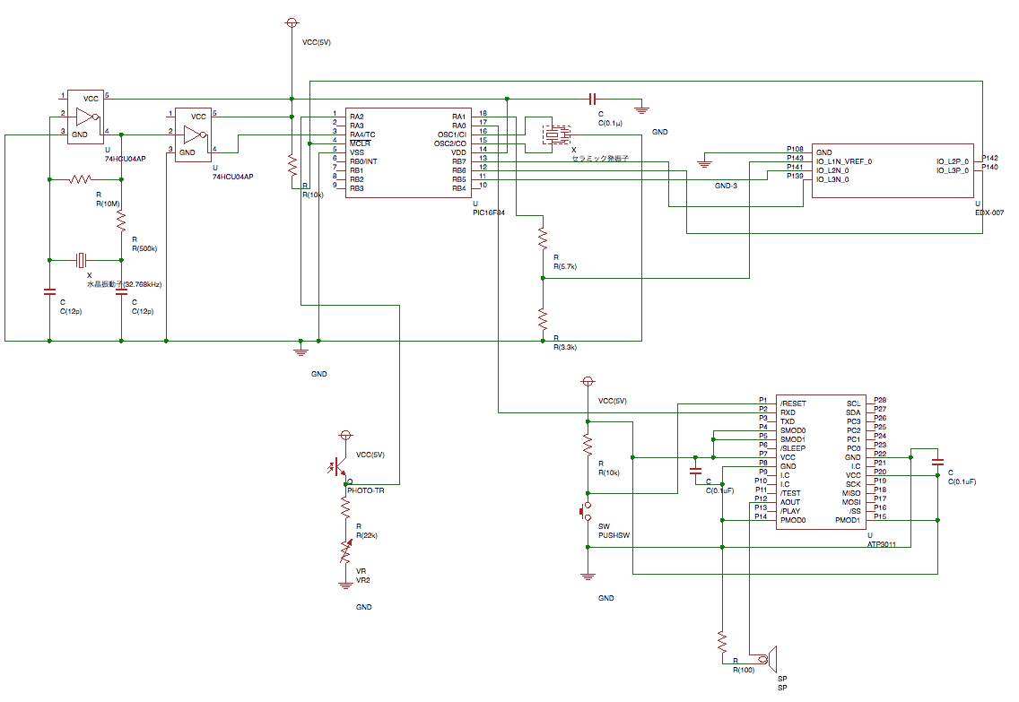 音声合成の仕様上記を踏まえて、回路図は下記のようにしました。相変わらず適当です。左下はリモコンから発せられる赤外線をキャッチするためのセンサー(フォトトランジスター)、右下は音声合成LSIとスピーカーです。スピーカー(ipod用のものを使用)には保護のため直列に100Ωの抵抗をつけただけで、特にアンプは使っていません。音声合成LSIにはパスコンを両サイドにつけています。これがないと、動作が不安定になりました。