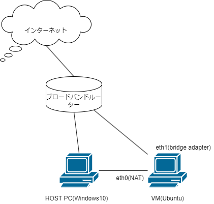 このように設定により、元々設定されていたVMのデフォルトゲートウエイ(HOST PC)が削除され、その代わりにブロードバンドルーター(192.168.0.1)をデフォルトゲートウェイとして新たに設定します。こうすることにより、インターネットからVMに届いたSYNパケットに対する応答(SYN/ACK)は、直接ブロードバンドルータに送られるため、送り元IPアドレスの変換は行われません。