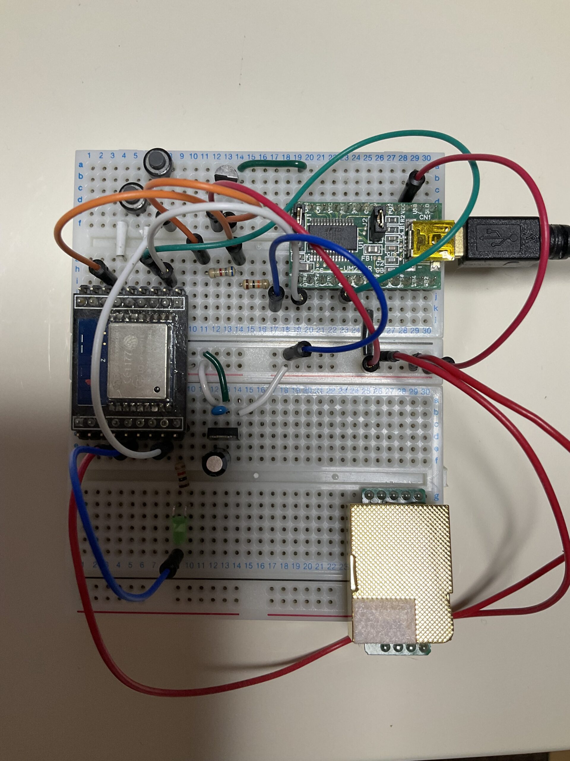 あと、以前の回路ではFT232RLの3V3OUTピンからESP-WROOM-02に電圧を供給していたのですが、今回温度センサーも追加したためか不安定(起動したと思ったらすぐにリセットしてしまう)な状態になってしまった(こちらのページにあるようにこのピンが50mAまでしか対応していないためと思われる)ので、3.3Vの定電圧レギュレータを新たに追加してこちらから電圧を供給するように変更したところ、安定して起動するようになりました。上の写真でいうと中央の左下にある黒い四角の部品が定電圧レギュレータです。一応電圧を安定させるために電解コンデンサと積層セラミックコンデンサをかましています(参考ページ)。