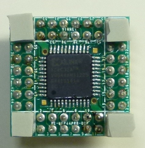 これだけだとユニバーサル基板とかブレッドボードにつけられないので、秋月電子さんで変換基板(0.8mmピッチQFP44ピン)を購入し、これに半田付けしました。