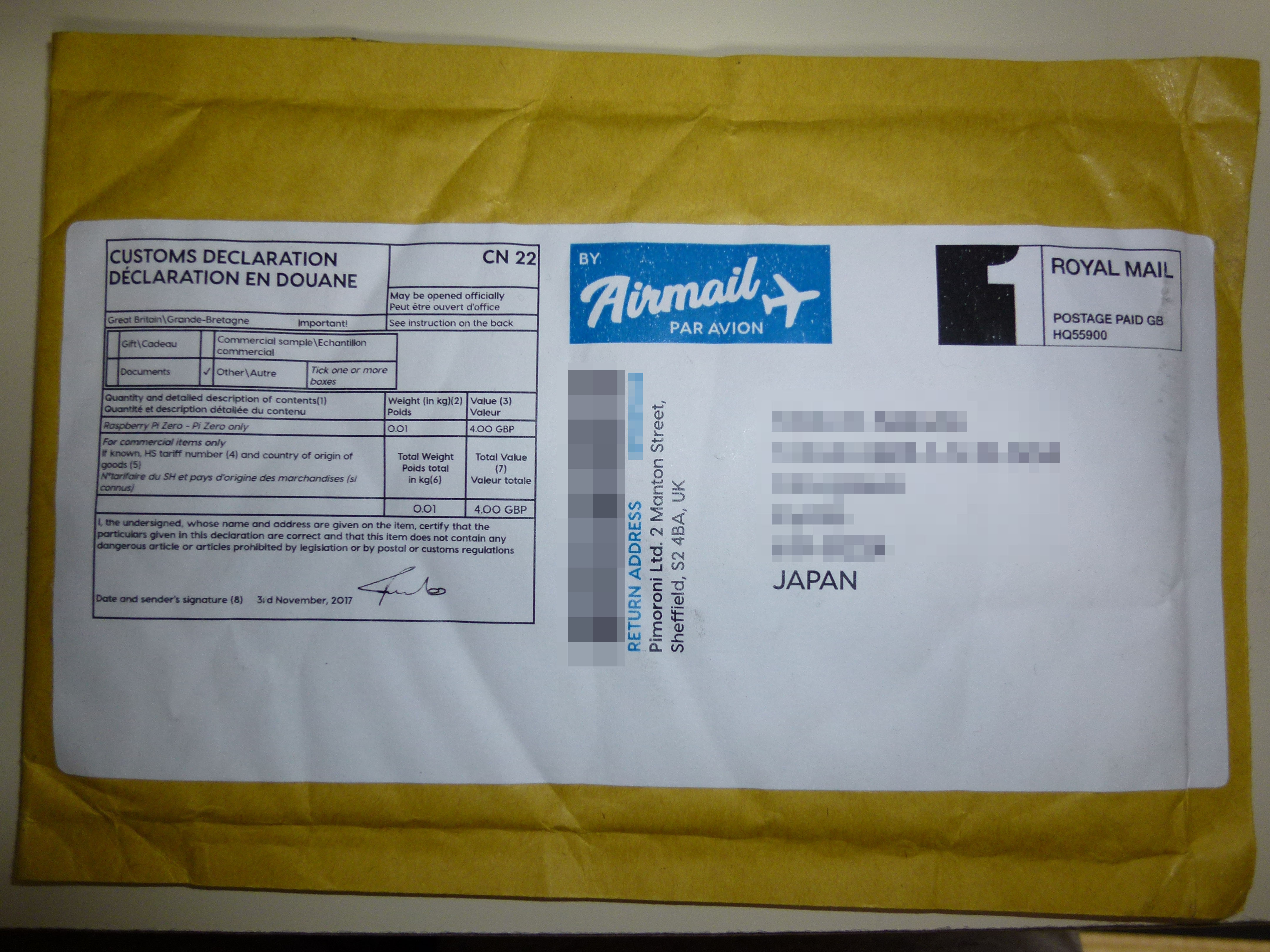 私が購入した時はラズパイZeroが4英ポンド、送料が5.5英ポンドで、送料の方がラズパイより高かったです。やはり日本で買うより割高(1英ポンド=148.7円なので送料込みで約1,500円)ですが、どこも売り切れなのでしょうがないですね。ちなみに、11/4に発注して届いたのは11/17でした。