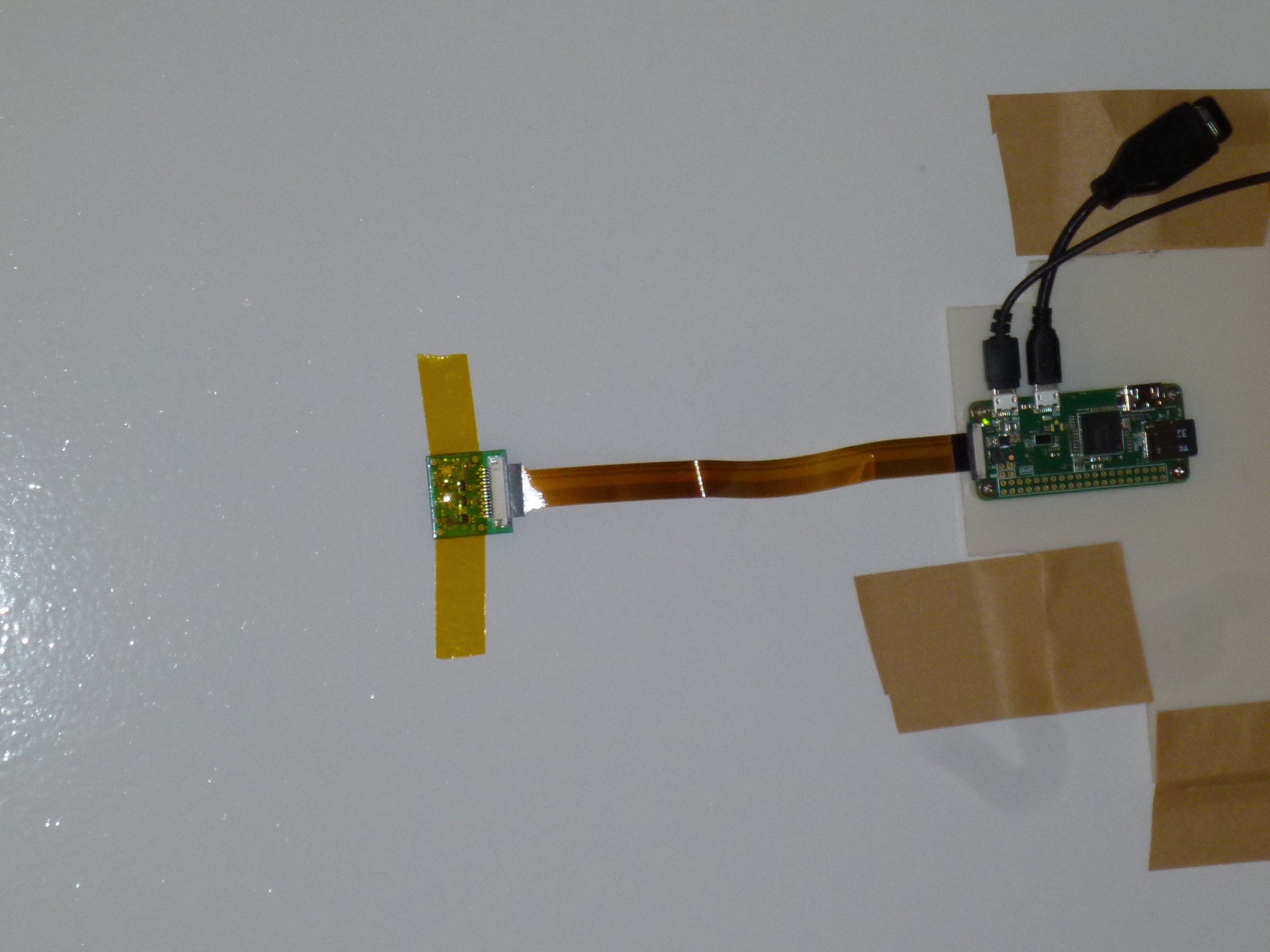 画像が回転してしまってますが、左が上です。プラ板にラズパイをネジで固定して、それをドアにガムテープで貼っつけてます。カメラは直接ドアスコープに差し込んで、テープで固定しました。