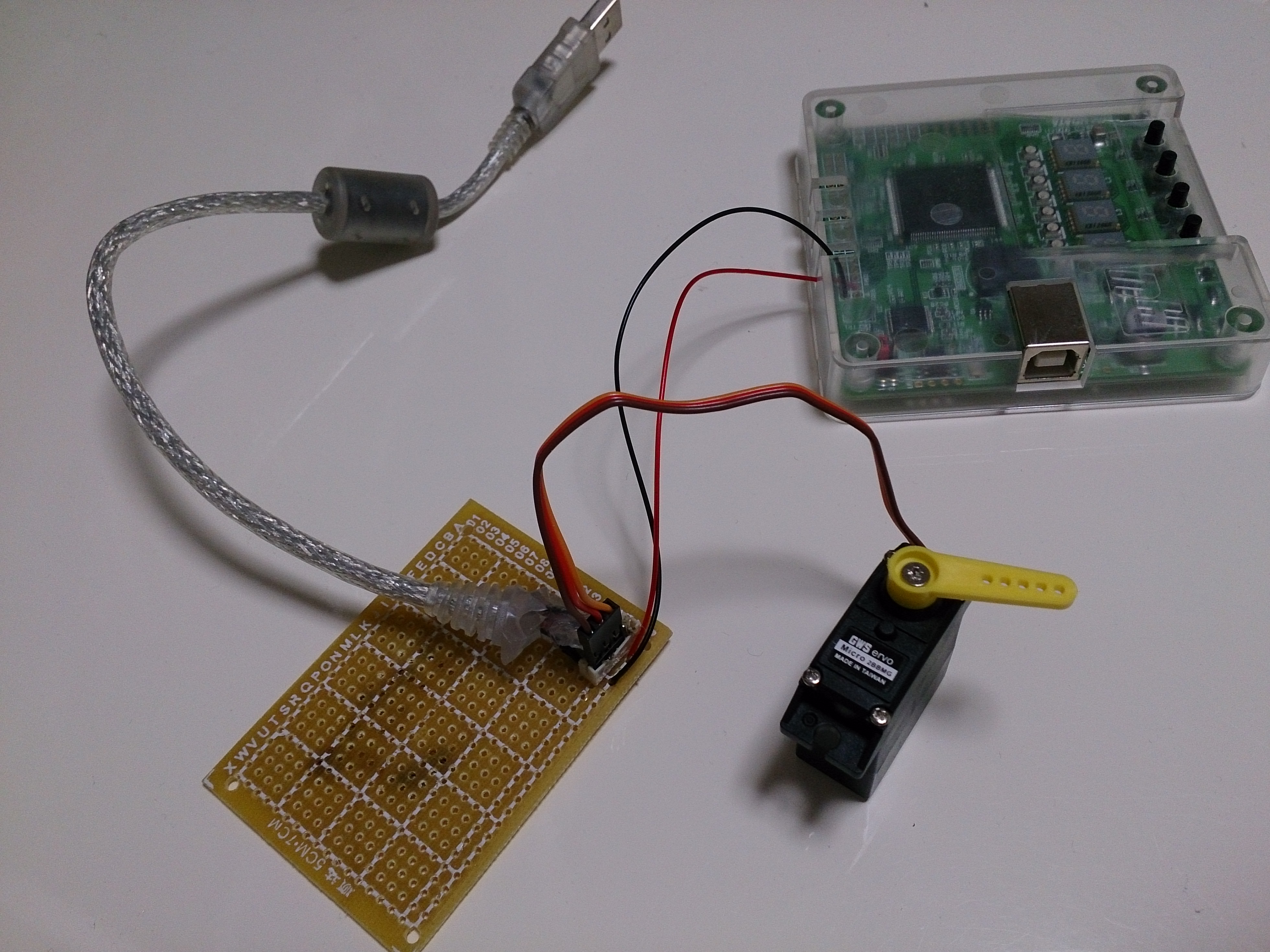 数年前に購入していたEDX-007というFPGA教育ボードを使って先日購入したサーボモーターを動かしてみました。EDX-007を使った理由はHDLの勉強がしたかったからで、それ以外に特に理由はありません。また、できる限りコストを下げたかったので、モーターの電源はUSBケーブル経由でPCからとり、電源回路は用意しませんでした。久々の電子工作だったので、結線するのに手間取りましたが、一回目のコンフィグレーションであっさり動いてしまいました。サーボモーターがいろいろ仕事をやってくれているので当然かもしれませんが、こんな単純な回路でも動くとやっぱり嬉しいものです。参考にした「二足歩行ロボット製作超入門」という本ではマイコンのPWM出力とサーボの信号線の間に1kΩの抵抗を入れていたのですが、今回使用したFPGAのI/Oピンとモータの信号入力は直接繋いで抵抗は入れませんでした(他に参考にしたサイトでは抵抗を使ってなかったので)。また、「FPGAマガジンNo.7」では、FPGAの制御信号にバッファを入れて5Vに近い電圧にしていたのですが、持ち合わせがなかったので、I/OピンをLVCMOS33(3.3V)に設定しました。部品としては、EDX-007とRCサーボ以外はコネクタやケーブル類だけです。ちなみに今回実装したVerilogHDLのソースは下記のようなものです。EDX-007についているボタンを押すと、サーボモーターが回転して角度が変わるだけの単純なものです。